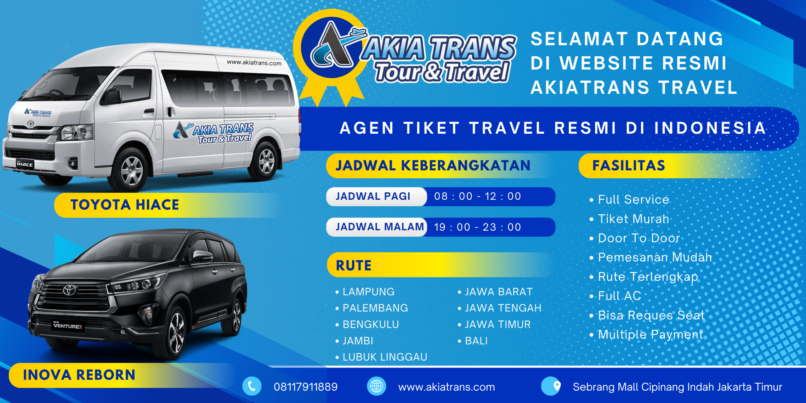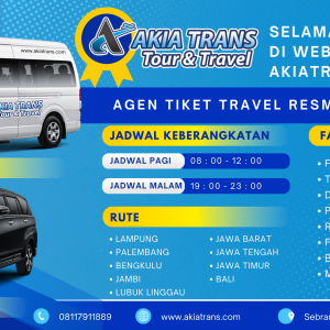 Akiatrans.com merupakan biro perjalanan resmi yang terpercaya nyaman, aman dan amanah, siap melayani kebutuhan Travel Anda dengan layanan Antar Jemput dari rumah/titik jemput sampai tujuan (Door to Door). Keberangkatan setiap hari dari dan ke Kota Tujuan Utama serta melayani travel ke kota-kota yang dilewati.Akiatrans.com tidak hanya melayani bidang transportasi travel, tapi kami juga siap mengirimkan paket Anda dengan layanan One Day Service (Delivery Express) – Jaminan satu hari sampai dan rent car/carter mobil. Dengan jadwal yang pasti, Admin yang Fast Respons, Driver Profesional yang sopan dan berpengalaman selama bertahun-tahun serta armada yang luas dan nyaman, Sahla Travel siap dan selalu berupaya memberikan pelayanan terbaik demi mewujudkan kenyamanan perjalanan Anda.Berikut ini beberapa layanan kami : Travel Reguler, Travel untuk wisata, carter/sewa travel dan juga menerima pengiriman paket kilat dengan harga kompetitif.Bersama Akia Trans traveling kini jadi lebih mudah.